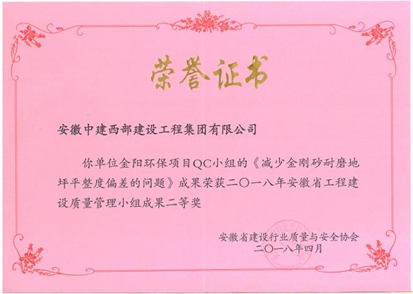 2018年度QC成果榮獲安徽省建筑業(yè)優(yōu)秀質(zhì)量管理獎項