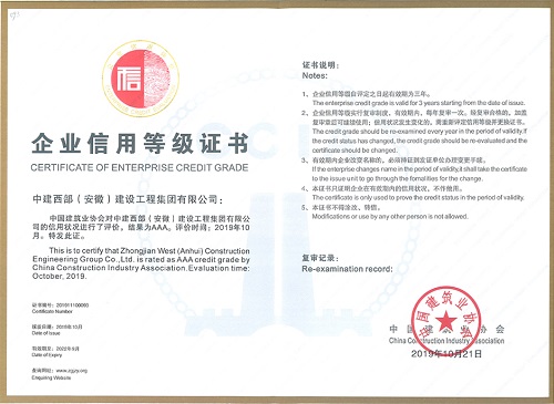 2019年10月,在本年度全國建筑業(yè)AAA級信用企業(yè)評價工作中,中建西部在全國各地區(qū)和有關行業(yè)建筑業(yè)(建設)協(xié)會推薦的優(yōu)秀企業(yè)候選單位中脫穎而出,順利通過建設系統(tǒng)相關網站上排查、專家評價組審定和網上公示,被評為“全國建筑業(yè)AAA級信用企業(yè)”。