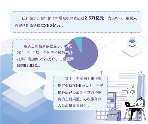 “辦好惠民實事”如何體現?減稅降費關系市場主體紓困解難,廣大企業特別是中小微企業期待著政策紅利進一步釋放。確保優惠政策直達快享,正是“春風行動”的一項重要內容。2020年,在疫情發生后,國家出臺一系列有針對性的減稅降費政策,企業需要政策落實快、落實準、落實細。稅務總局明確提出“優惠政策落實要給力”,以最快速度、最高效率確保政策紅利直達市場主體。統計顯示,全年預計新增減稅降費超過2.5萬億元,為399萬戶納稅人辦理延期繳納稅款292億元。
