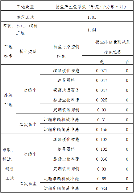 (1)月排放量=(揚塵產生量系數-揚塵排放量削減系數)×月建筑面積(施工面積、拆遷面積)