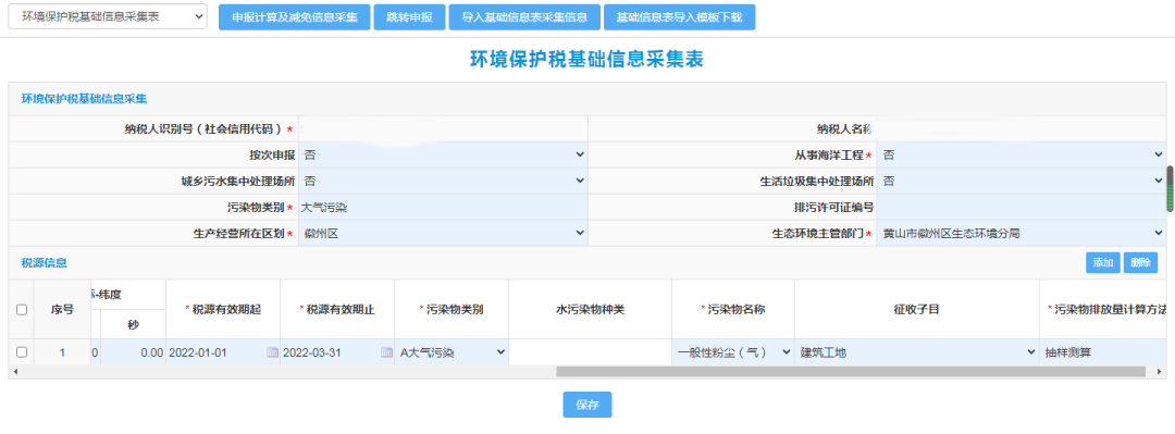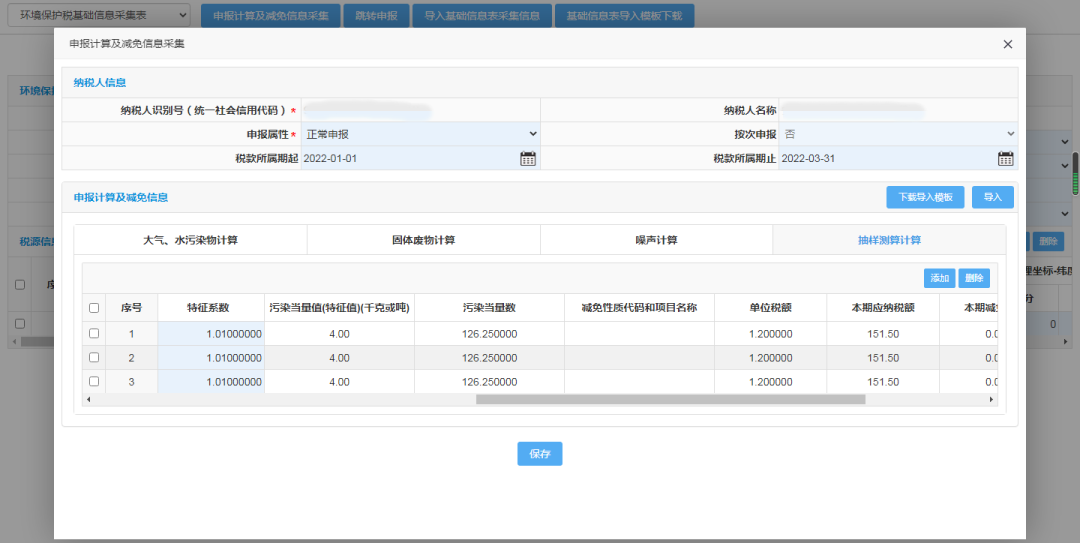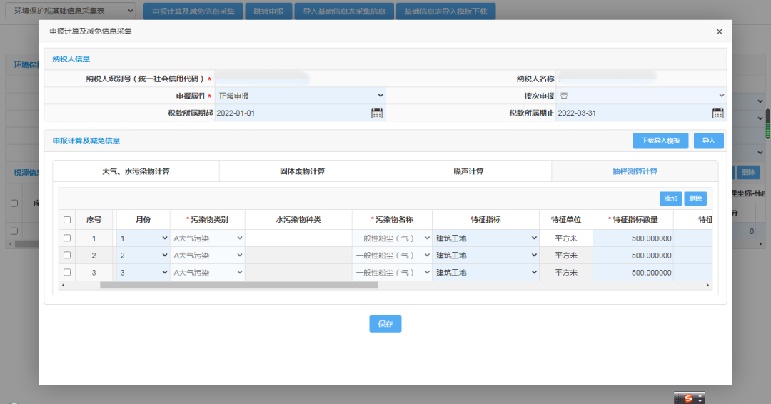 依次輸入帶“*”的必填項,注意排放口編號自擬,污染物名稱選擇“一般性粉塵(氣)”,征收子目選擇“建筑工地”、“市政、拆遷、道橋”,污染物排放量計算方法選擇“抽樣測算”,點擊保存,進入申報計算及減免信息采集界面。