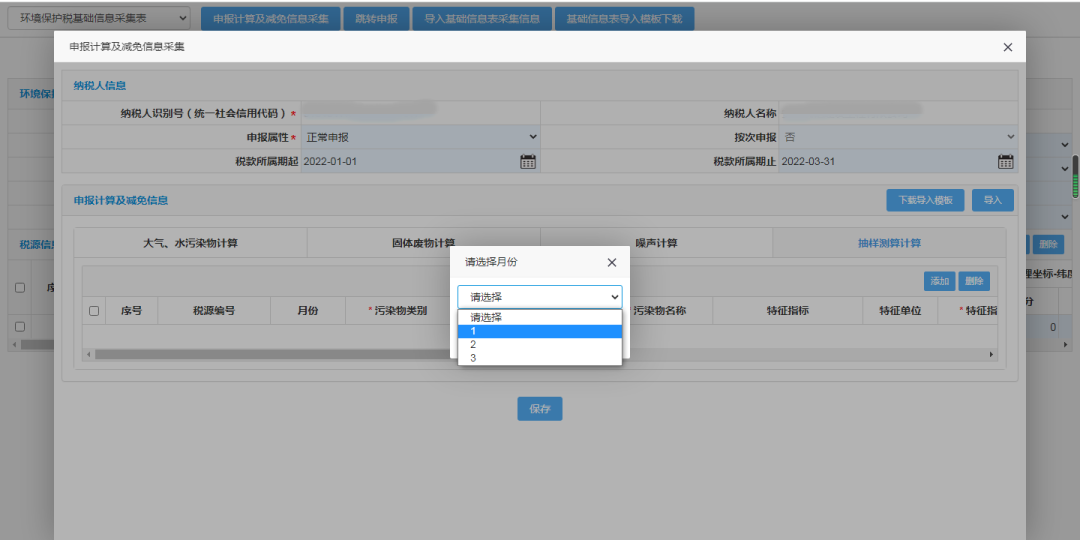 添加申報季度內全部月份數據后,輸入“特征指標數量”即月建筑面積和“特征系數”(特征系數默認為揚塵產生系數1.01,可自行修改),自動計算應納稅額,點擊保存。
