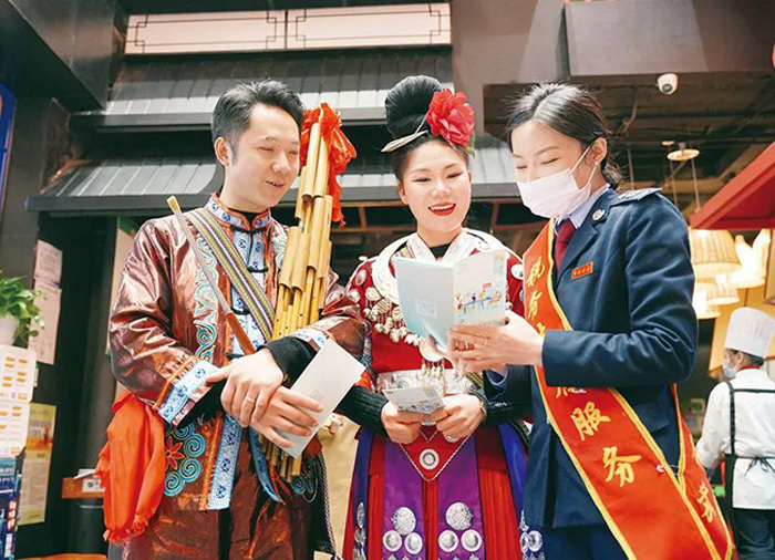 今年以來,稅務部門優化實施小規模納稅人減征增值稅、小微企業和個體工商戶減征所得稅等一批覆蓋面更廣的政策,突出對小微企業、個體工商戶的支持。圖為2023年3月16日,國家稅務總局貴陽市南明區稅務局干部走進當地國家非遺項目酸湯魚餐飲店,講解稅收優惠政策。 國家稅務總局供圖 梁詩茂/攝