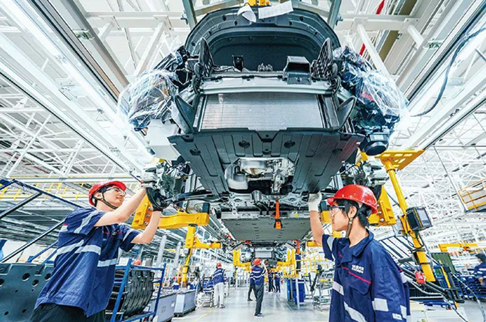根據黨中央、國務院統一部署,我國新能源汽車車輛購置稅減免政策將延長至2027年底。圖為2023年8月18日,位于江蘇南京市溧水區的南京長安汽車新工廠,工人們正在組裝全新長安新能源SUV,一輛輛新車迅速完成組裝、下線,生產氛圍火熱。 人民圖片 朱紅生/攝