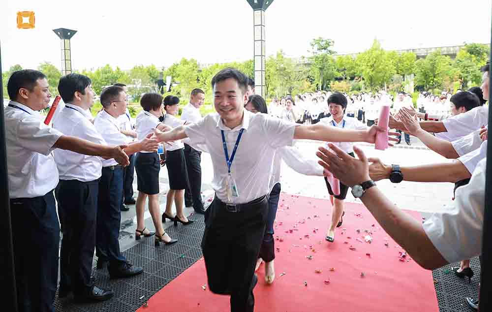 上午10時,員工在集團總部大樓廣場集合,管理團隊等候在紅毯兩側,與迎面而來的多金奮斗者擊掌相慶,在簽到板上印下紀念章簽名,司慶慶祝早會就此拉開序幕。